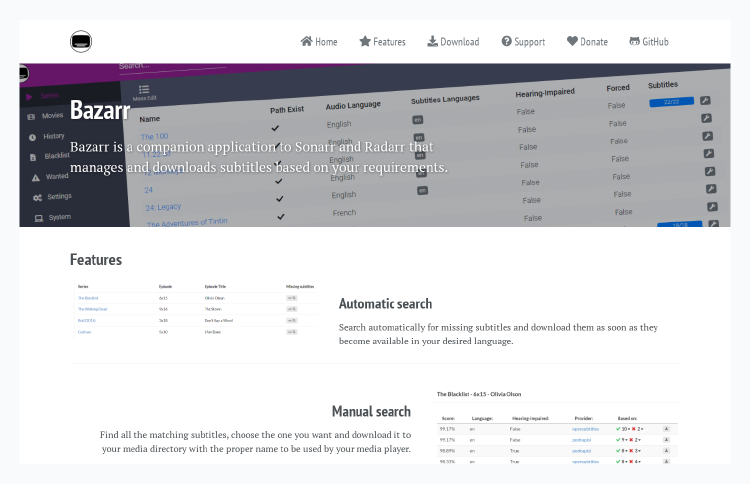 字幕自动搜 Bazarr是Sonarr和Radarr的完美搭档,专门负责管理影视剧的字幕下载。它能根据你的语言偏好自动搜索缺失的字幕,一旦有合适的资源就会立即下载。再也不用手动到处找字幕了。