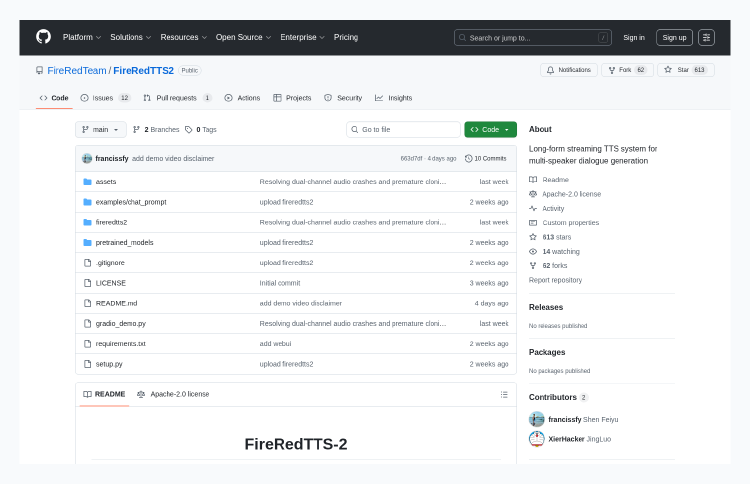 GitHub - FireRedTeam/FireRedTTS2: Long-form streaming TTS system for multi-speaker dialogue generation