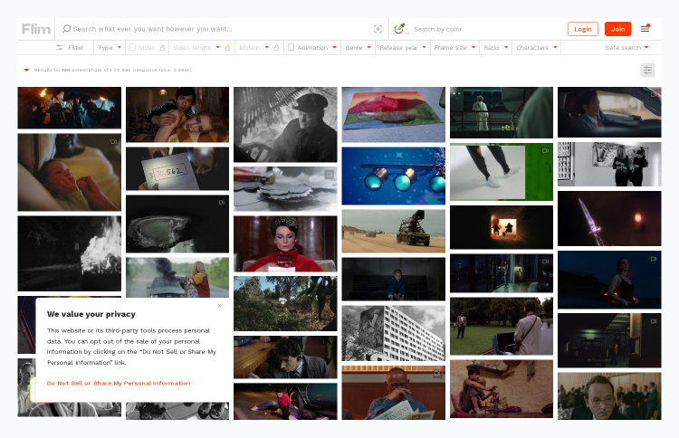海量资源 Flim是一个专门为创意工作者打造的图像数据库和截图搜索引擎,拥有超过150万张来自电影、电视剧、音乐视频和广告的剧照。它号称是全球最大的免费图像数据库之一,能快速帮用户找到表达创意所需的完美画面。对于设计师、视频创作者或任何需要视觉灵感的人来说,这里就像一个无尽的素材金矿。